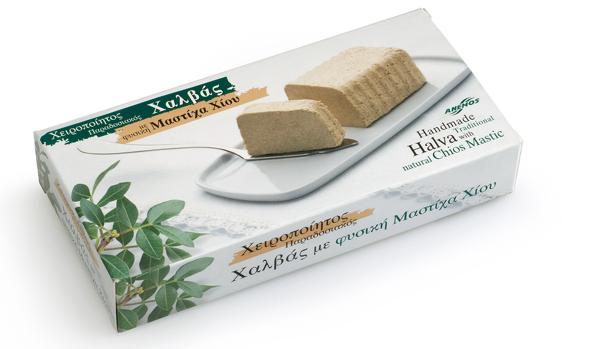 Ingredients: Tahini (crusted hulled sesame seeds), glucοse syrup, sugar, partially hydrogenated vegetable oils (palm oil), saponaria officinalis extract, Chios mastic powder (0,20%), Chios mastic oil.